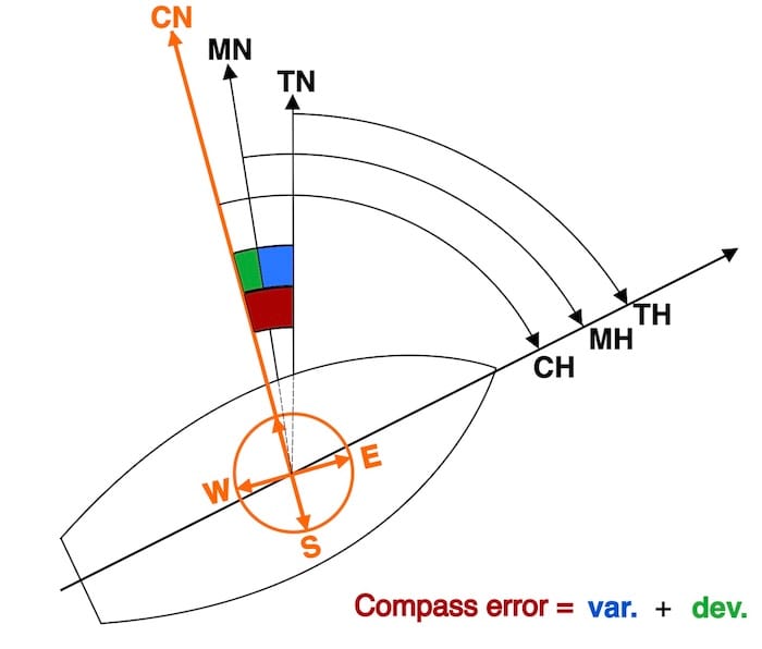 This diagram assumes no wind, current, or leeway, so Compass Heading (CH) is taken to be equal to Compass Course (CC). In real conditions, these two values often differ.