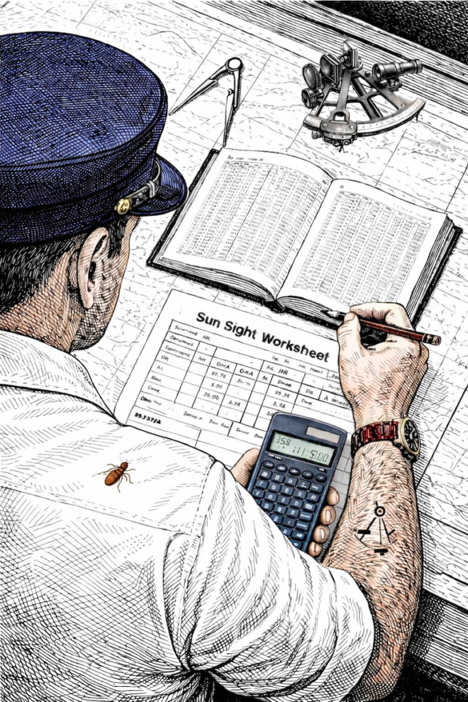The idea is to go to sea carrying only a few pages of ephemerides and a scientific calculator — or, for the purists, a set of logarithm and azimuth tables.