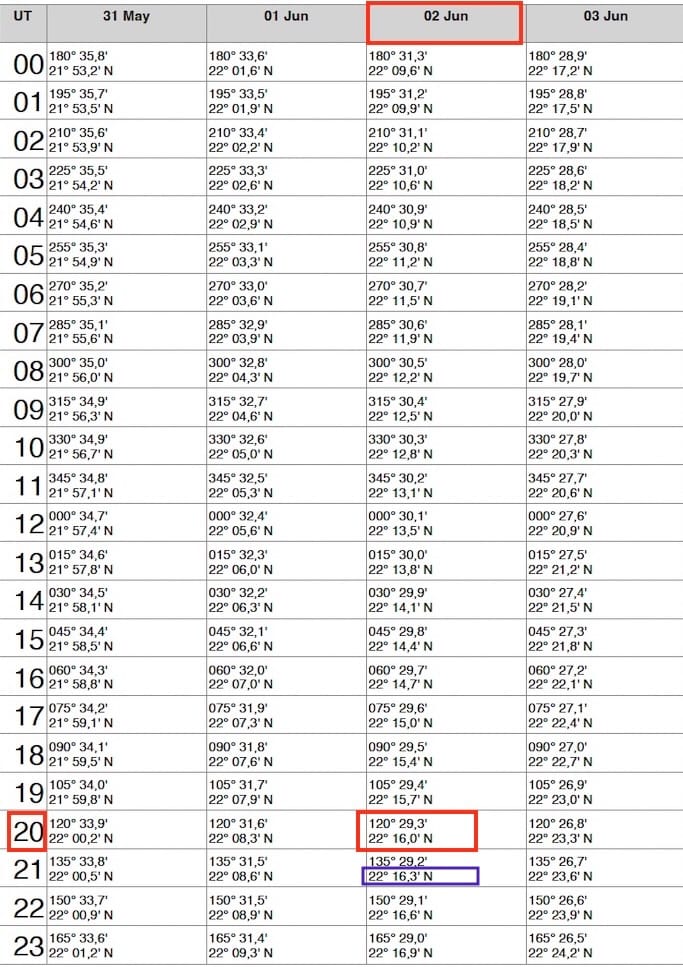 The solar positions (GHA and Declination) used in this almanac are computed from the JPL DE440s planetary ephemeris, developed by the Jet Propulsion Laboratory (NASA).