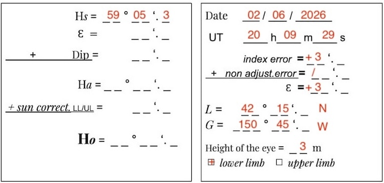 First Step: Observe the Sun’s altitude with the sextant (Hs) and record the corresponding time, the date, the dead reckoning position, the height of eye, the index error, and the use of the Sun’s lower limb.